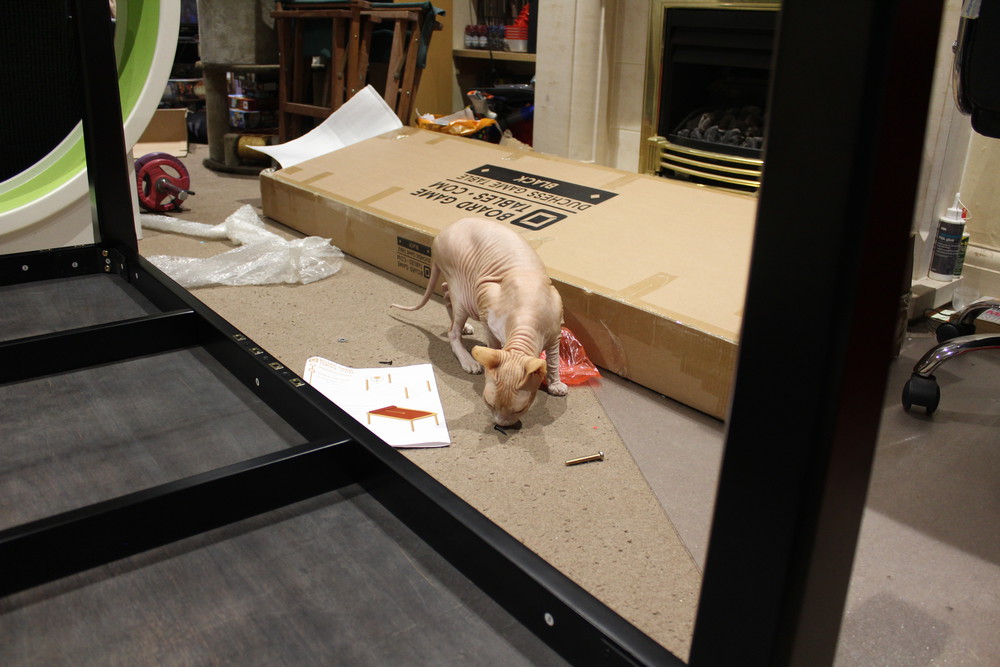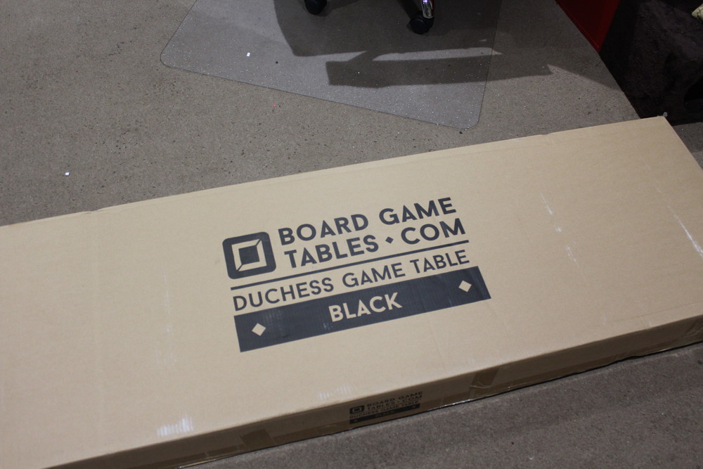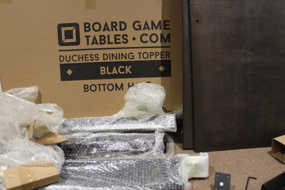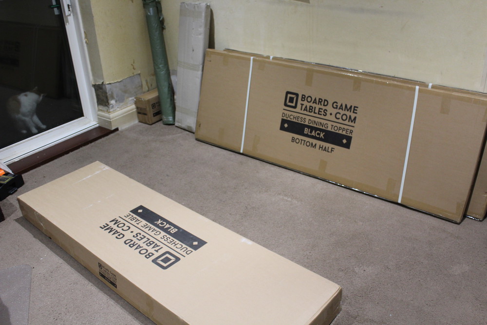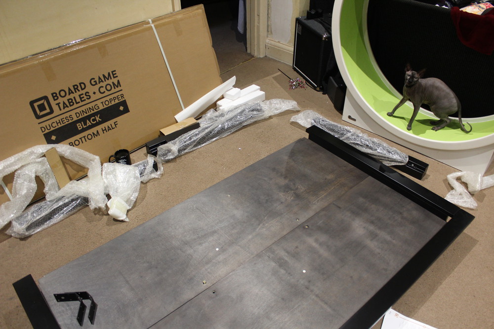 We recently received our Duchess from BoardGamesTables.com's Kickstarter, while it was initially scheduled for delivery in February after many months of logistics and planning we received ours two days before leaving for Spiel in Essen. Rather than having to come back to building it we decided to go ahead and spend our regular Monday night gaming building her highness with a little help from the furless babies. We were done with enough time to play Yedo, result.